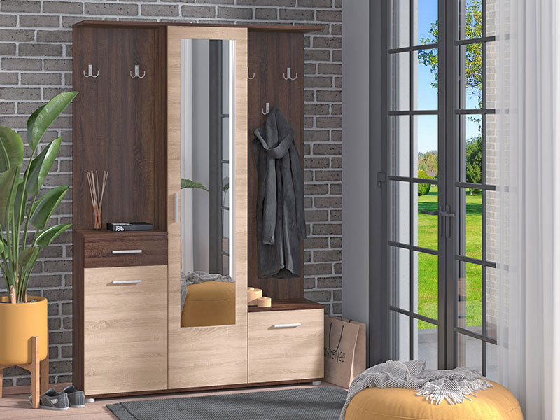 Претсобје на MARTIN, во темна сонома и сонома боја, ќе ја направи првата средба со вашиот дом ефективна и пријатна. Овој модел има хармонично организиран простор за употреба за чување сезонска облека и чевли, така што ќе постигнете функционално организиран простор, додека централно поставеното огледало носи чувство на просторност.Монтажа на плочест мебел се наплаќа 10% од вредноста на производот.