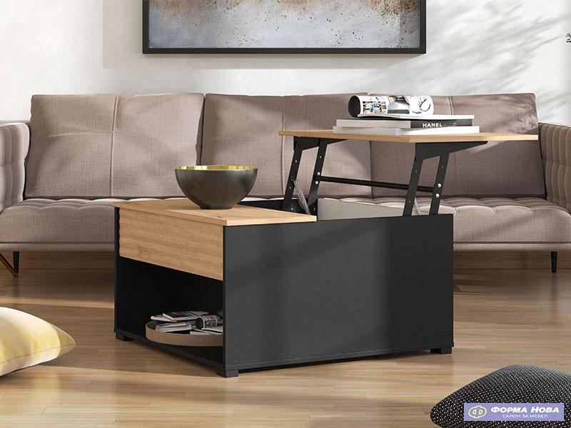 Клуб масата TARANTO се карактеризира со артисан храст и црн декор кој е модерен додаток на вашата дневна соба. За високата функционалност придонесува горната полица која може да се подигне и може да се користи за работа или за олеснување на послужувањето. Монтажа на плочест мебел се наплаќа 10% од вредноста на производот.