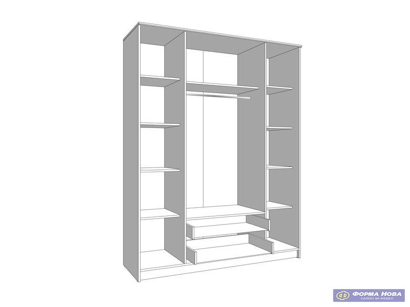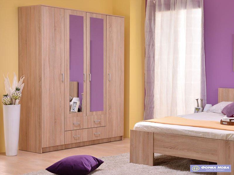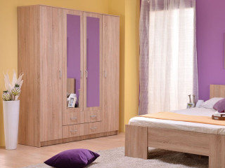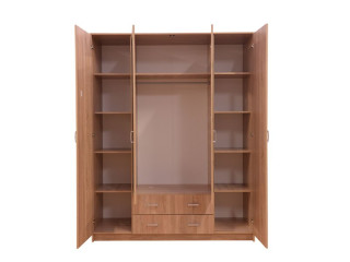 Четворокрилниот ормар ХАНА 4К2Ф2О, во дезен сонома храст, со гардеробна шипка во централниот дел, четири полици и две фиоки, функционално ќе допринесе за организација во амбиентот. Монтажа на плочест мебел се наплаќа 10% од вредноста на производот.