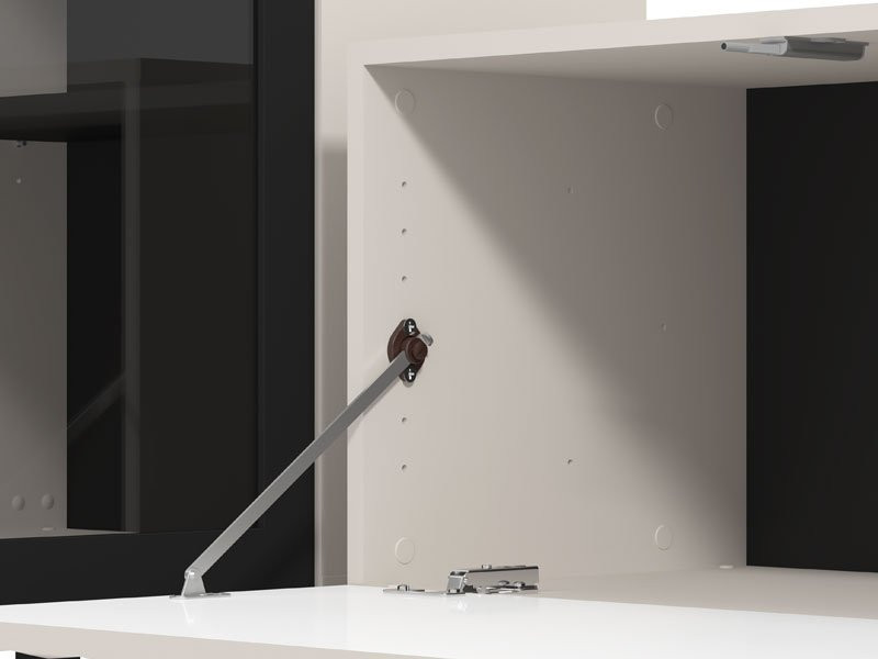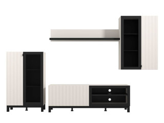 Регал MACON, во комбинација од декор од кашмир и црна мат фолија, е дизајнирана да ги задоволи функционалните и естетските барања во декорацијата на дневната соба. Полицата MACON овозможува практично опремување на дневната соба, благодарение на употребливиот простор составен од отворени и затворени полици за складирање, еден застаклен дел со полици за специјални вредни предмети, како и просторот предвиден за ТВ (до 60" ) и друга аудио-визуелна опрема Постои можност за додавање осветлување.