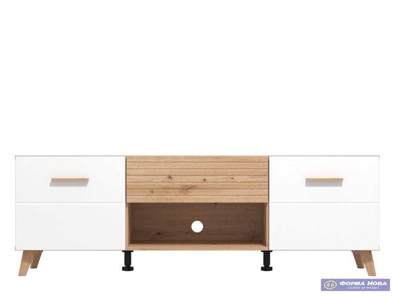 ТВ Полицата BRETAGNA 150 е направена во комбинација на артисан храст декор со сегменти во декор од бела медијапан фолија, кои внесуваат освежувачка естетика во околината. Дрвените рачки го поврзуваат декорот во една естетска целина, додека високите ногарки ја истакнуваат нивната елеганција. Два странични затворени сегменти, практична фиока, како и отворена полица, ефикасно придонесуваат за функционална организација на дневната соба.