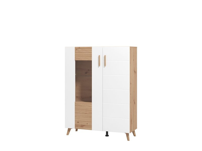 Витрината BRETAGNA 2K VS1 е изработена во комбинација на артисан храст декор со сегменти во декор од бела лакирана фолија, кои внесуваат освежувачка естетика во околината. Дрвените рачки го поврзуваат декорот во една естетска целина, додека високите ногарки ја истакнуваат нивната елеганција. Корисниот простор, тип на преграда, е поделен на затворен и застаклен сегмент, што покрај естетиката придонесува и за функционалност. Постои можност за додавање осветлување. Тој е дел од истоимениот систем на елементи за украсување на дневната средина, кои се одликуваат со карактеристиките на модерен дизајн обединет со префинет допир на елеганција.*Напомена: Цена без осветлување - Можност за додавање осветлување.